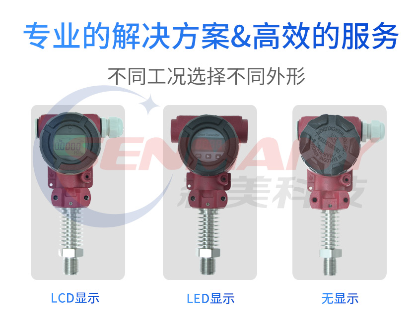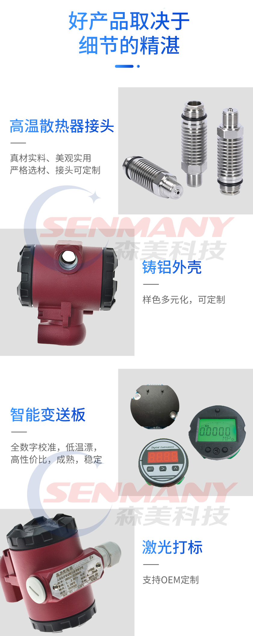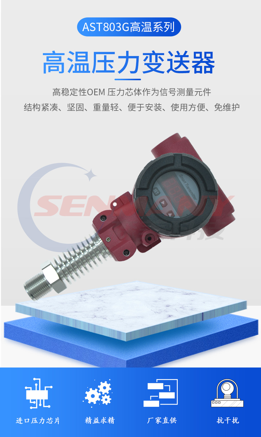 品牌:森美科技 型號:AST803G系列AST803G高溫壓力變送器采用耐高溫型壓力傳感器作為信號測量元件,并經(jīng)過自動測試和激光調(diào)阻工藝進(jìn)行了寬溫度范圍性能補(bǔ)償。產(chǎn)品經(jīng)過了長期老化及穩(wěn)定性考核等工藝嚴(yán)格篩選,性能穩(wěn)定可靠。該產(chǎn)品為兩線制4~20mADC信號輸出,可帶現(xiàn)場數(shù)字顯示,應(yīng)用于工作環(huán)境惡劣,要求能現(xiàn)場顯示被測壓力的場合,廣泛適用于機(jī)械、冶金、石油化工、電力等工業(yè)過程的壓力測量。